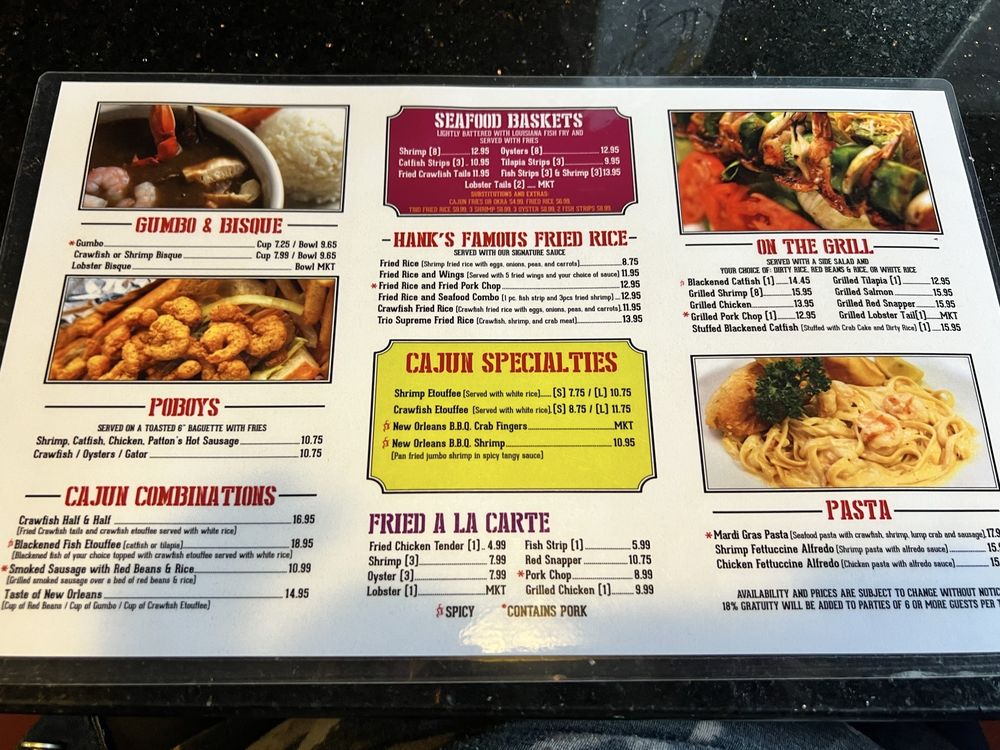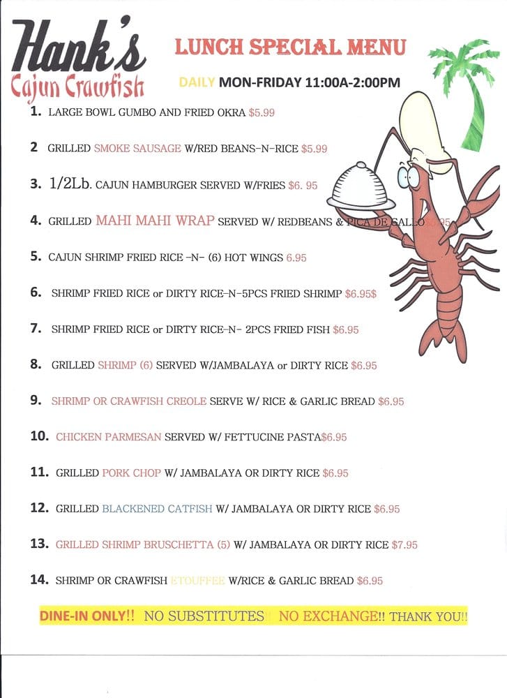 Introducing the menu at Hank's Crawfish Bar & Grill, located in Houston, TX, where Cajun/Creole cuisine meets a casual yet classy atmosphere. With a focus on seafood and beer, the menu offers a variety of starters such as alligator bites, crab cakes, and grilled butter oysters. Lunch specials feature dishes like crawfish etouffee and catfish poboy, while salads include options like chicken salad and shrimp salad. Customer reviews praise the crawfish, with one customer mentioning the fantastic service and attention to detail. The restaurant also offers vegetarian options, catering services, and a range of payment options including cryptocurrency. If you're looking for a taste of New Orleans in Houston, Hank's Crawfish Bar & Grill is a must-visit spot for a flavorful experience.